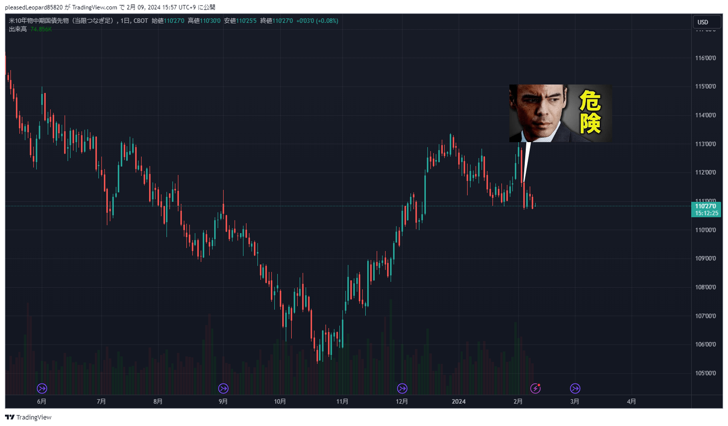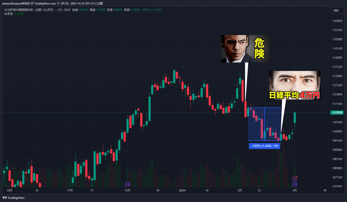 • これはアメリカの10年債券のチャート、2/2ぐらいから大きな陰線が2つ