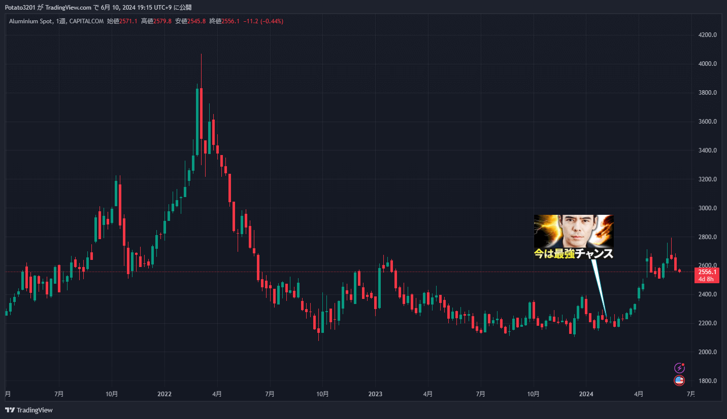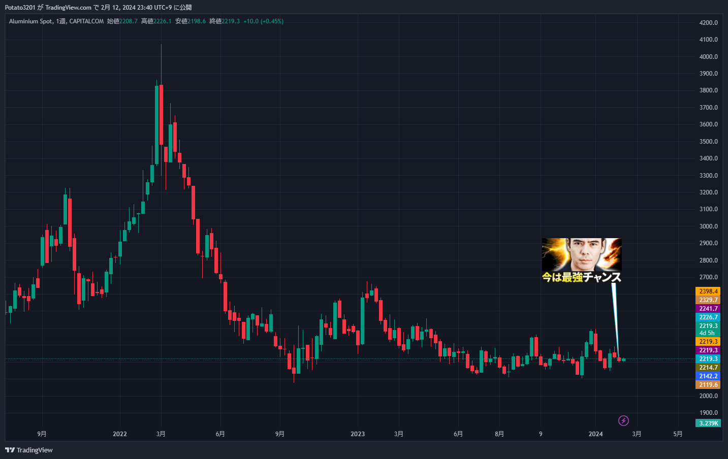 | アルミニウム | 検証中 | 2024/2/8 2215.3 | 2024/5/29 2783.1 25.63% | 2024/2/26 2175.6 -1.79% |