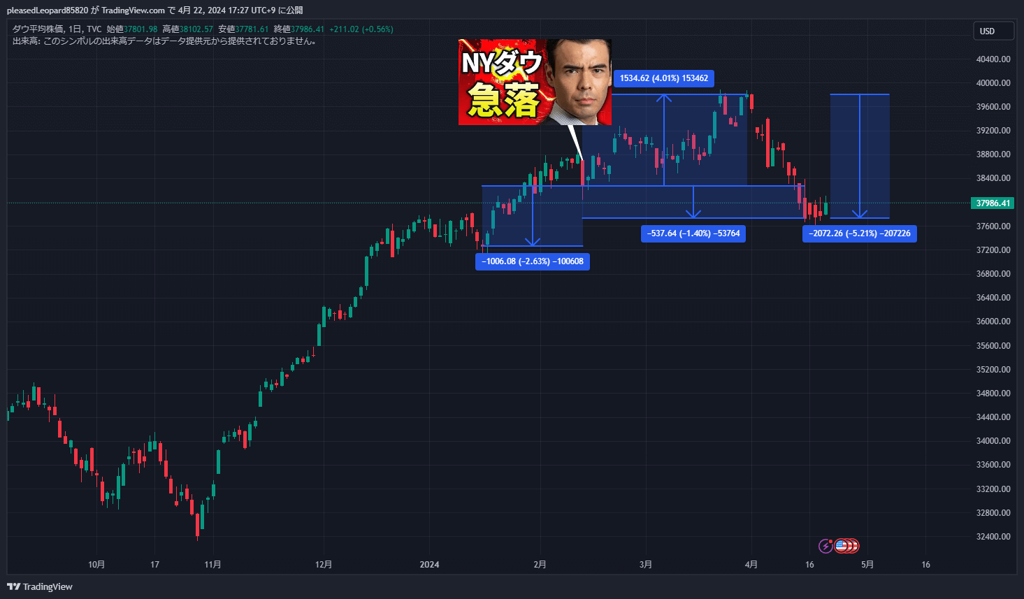 - 4/1からは急落して4/15に37,735.12ドル(-1.40%)まで付け、1週間多めに検証期間を設けたが4/19は37,986.41ドル(-0.75%)で検証を終了