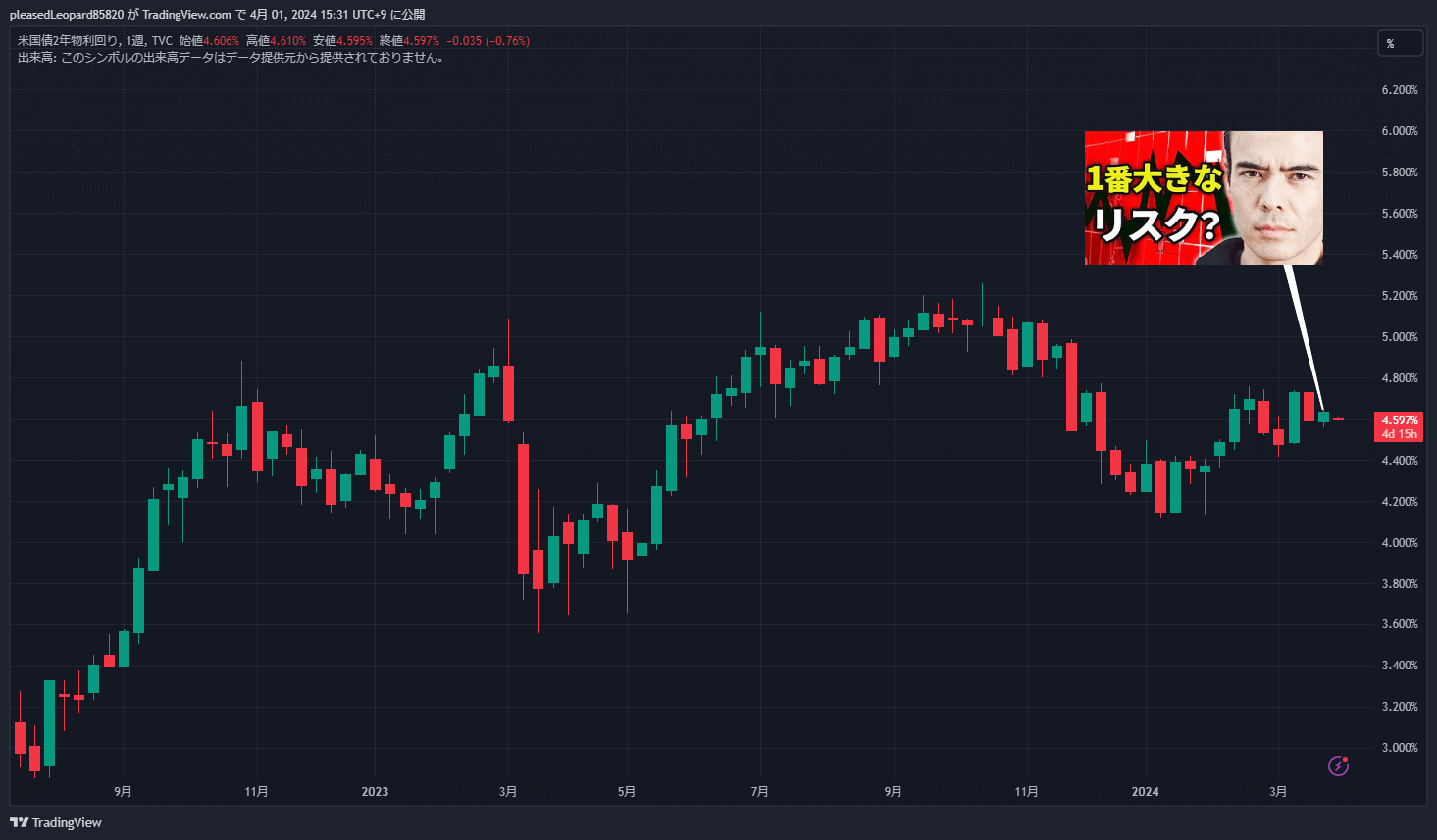 - 現在ウォール街は3回の利下げを期待しているが、利下げを当分するつもりがないので利回りがまた上がり株価が下がる→これが1番のリスク