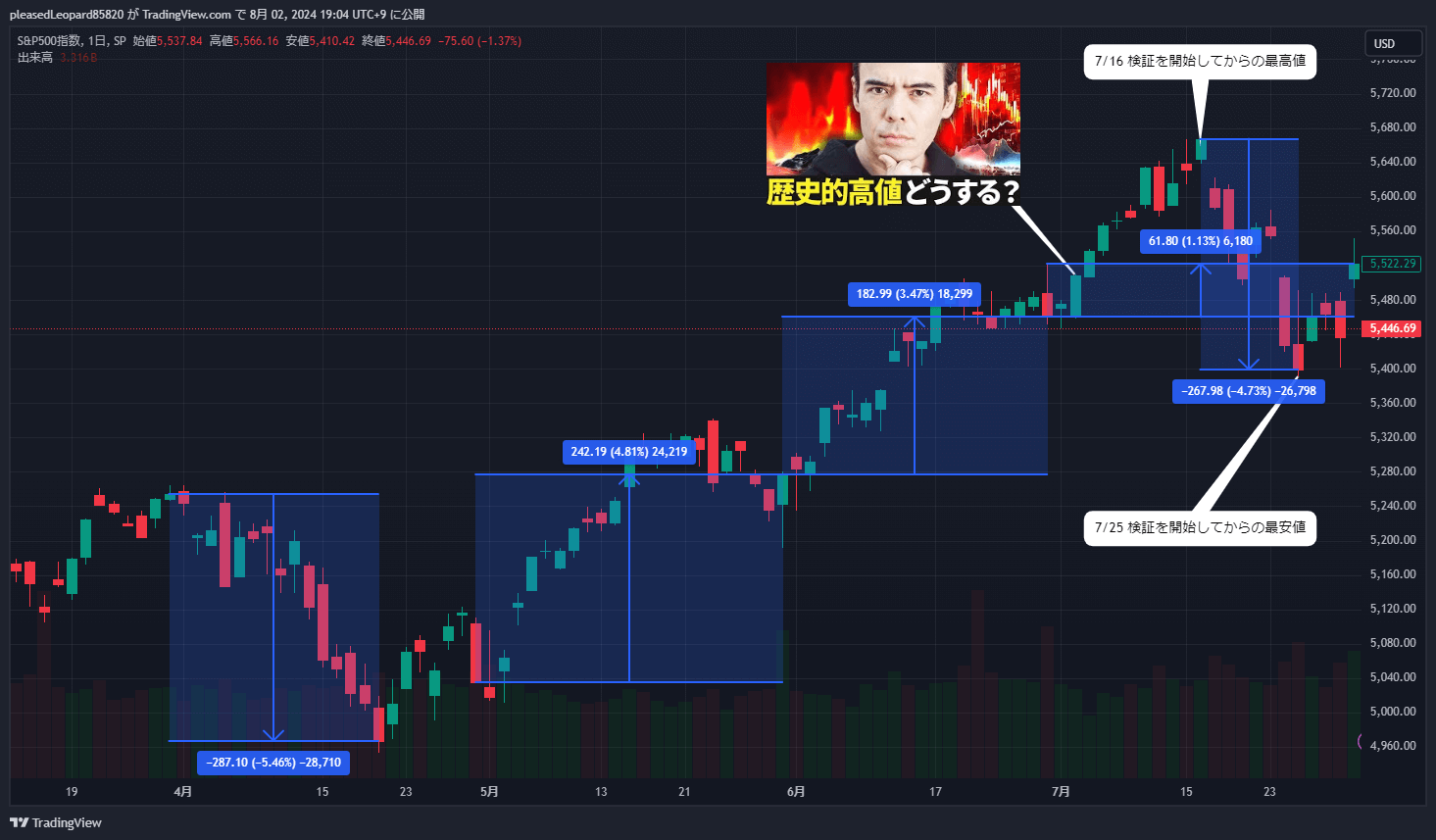 • 7/16までは上昇してピークを付けて、その後7/25までに-4.73%下落→その後反発して5,522.29ドルまで戻す