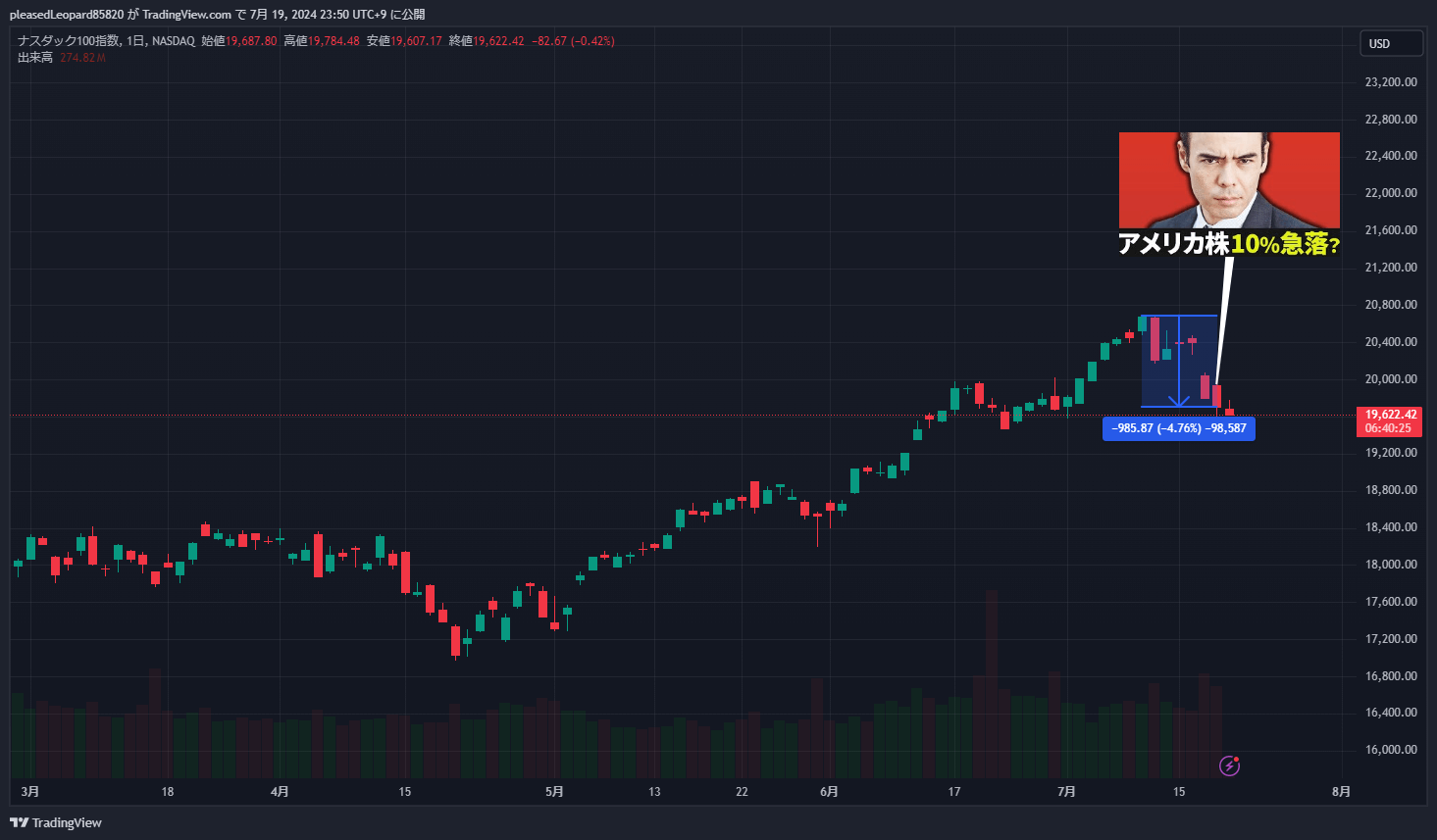 ナスダック100は7/18時点で7/10のピークから4.76%下落してるんだよね…
