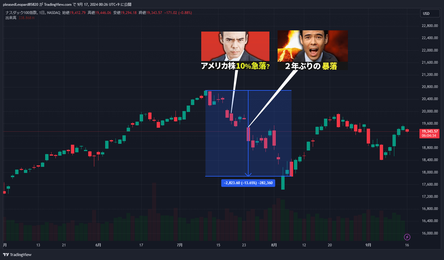 | ナスダック100 | × | 2024/7/18の終値から 19705.09 | 2024/7/18 19705.09 0.00% | 2024/8/7 17867.37 -9.33% |