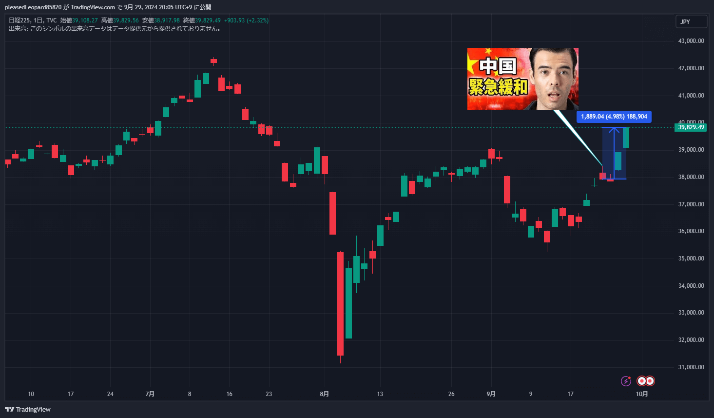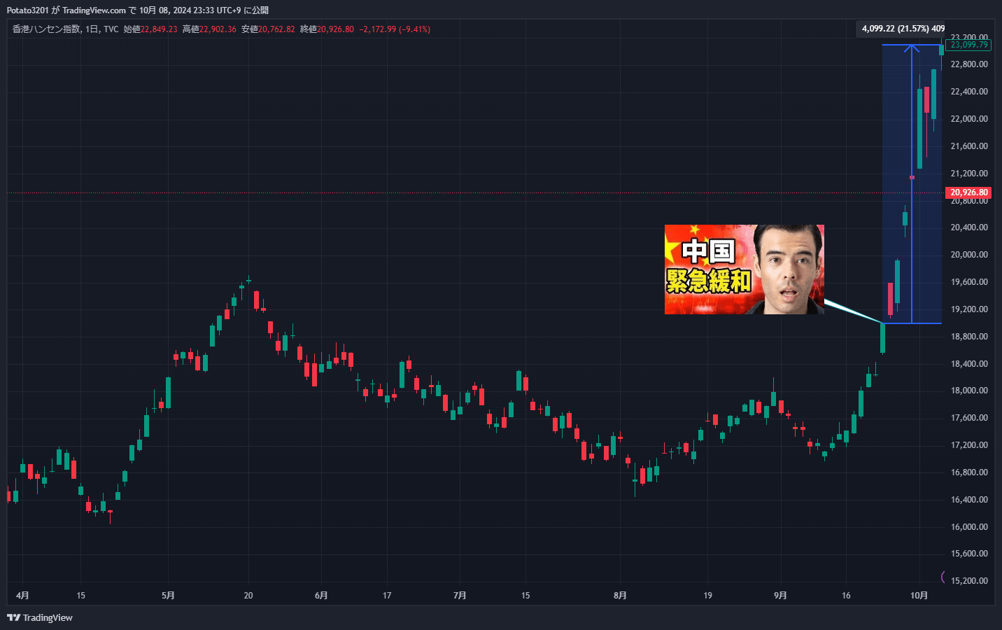 この大規模緩和の影響で米国では10月は急落暴落が起きない可能性もあり、中国の大規模緩和がアジア相場を持ち上げて、米国株も持ち上げて滑らかな上昇トレンドが続くシナリオも考えられるとも言っておるんじゃ