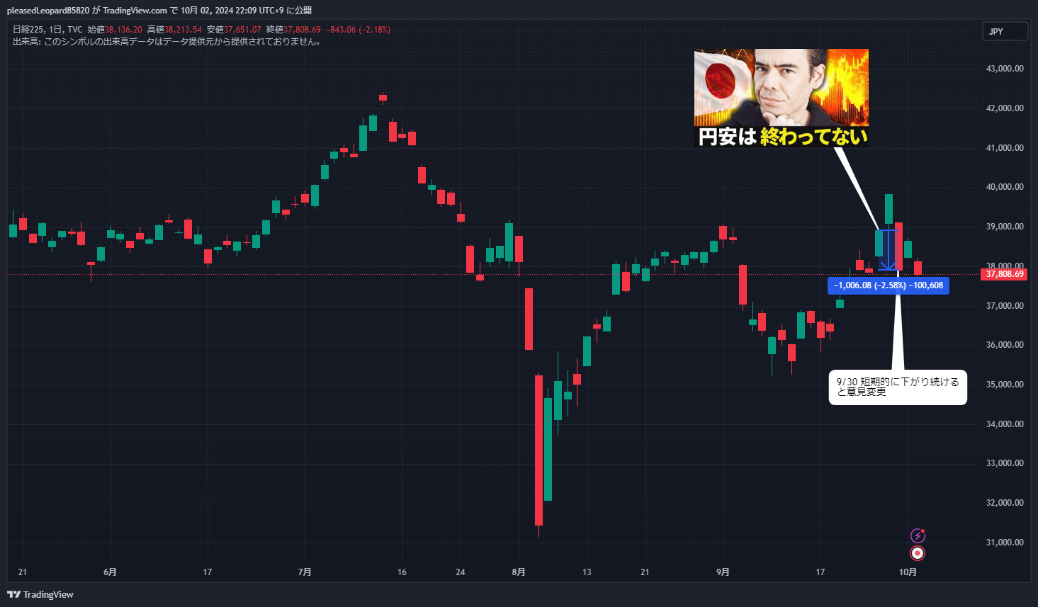 • 1~2週間上がり続けるとのことだったが、2営業日の9/30には9/26の終値から-2.58%の下落