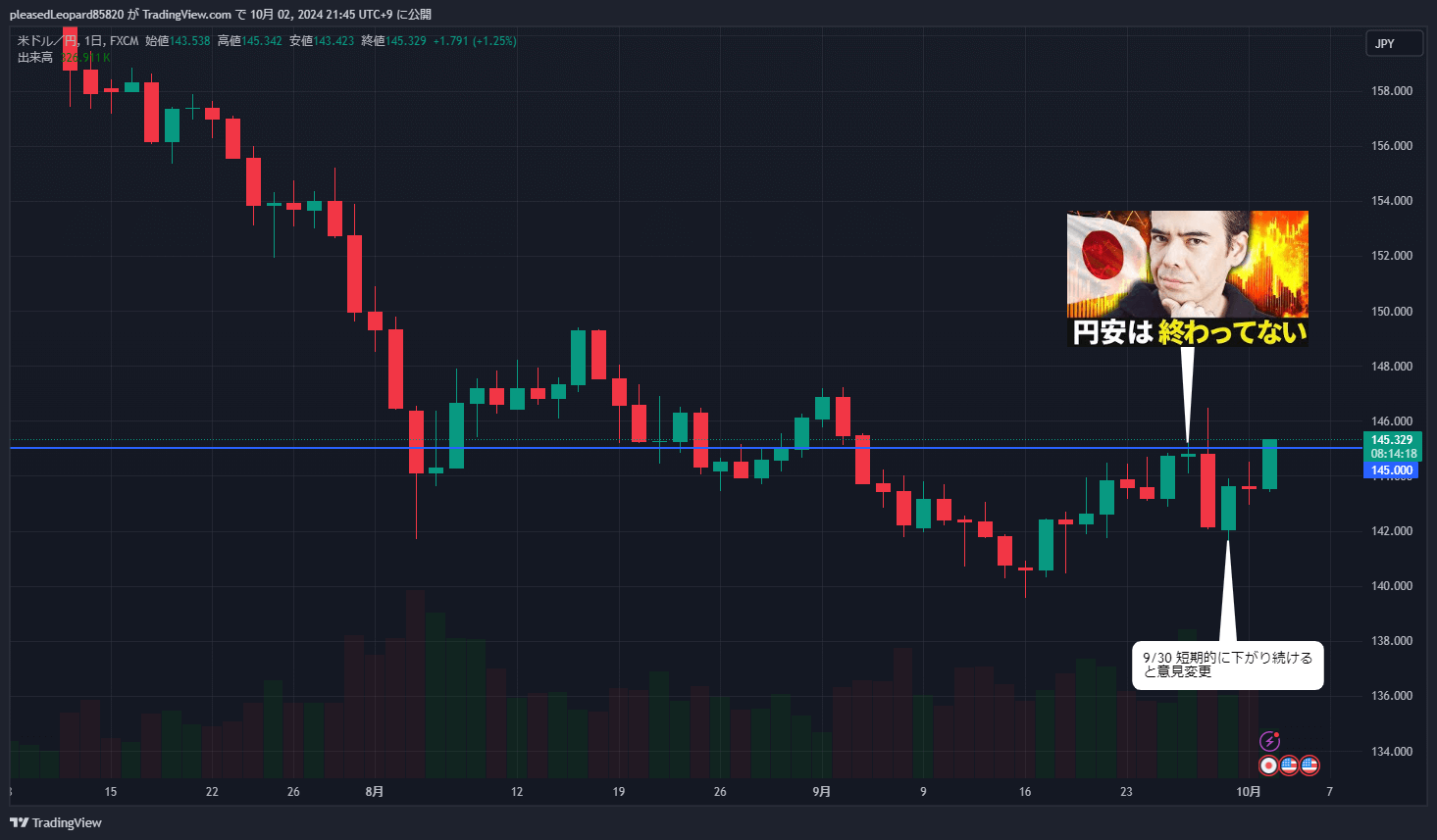 • ドル円は現在144円で、先週から大きく反発したので反発が止まって落ち着くと思う人がいると思うが、僕の考えでは落ち着かないと思う→もう少し円安が続く
