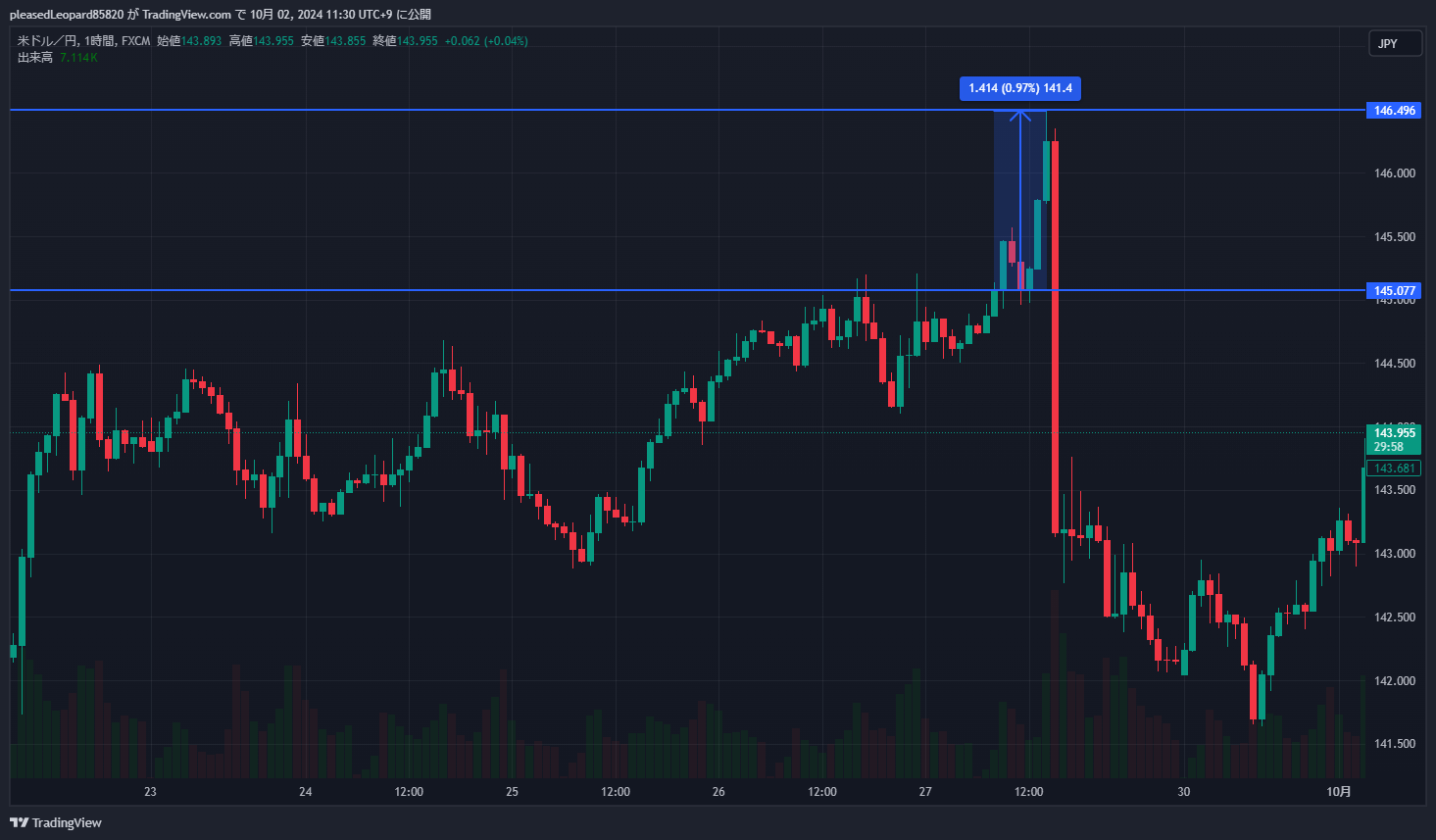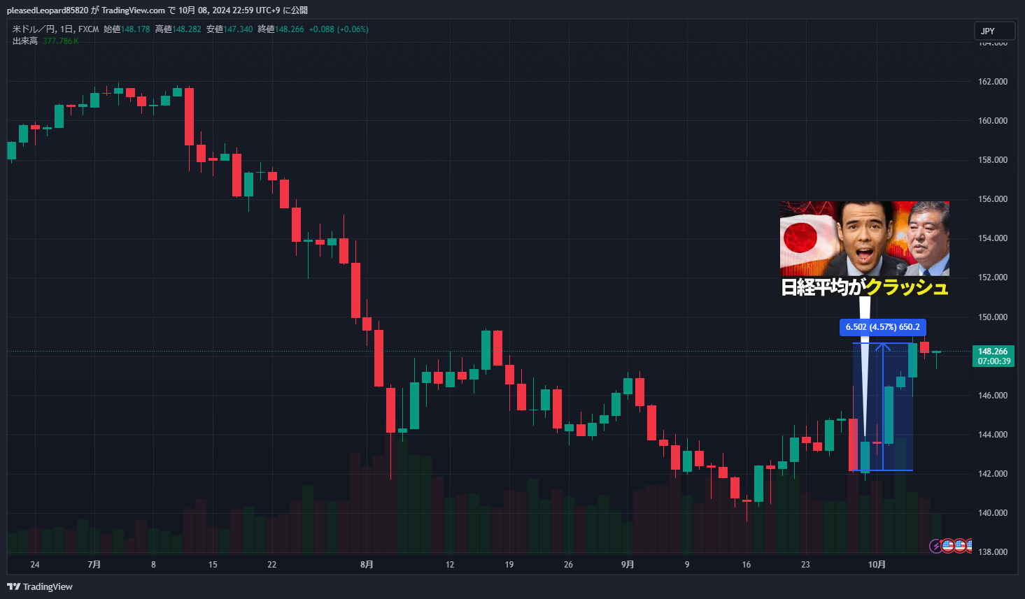 - 9/30の投稿日から上昇し続けて、10/4には148.656円まで上昇
