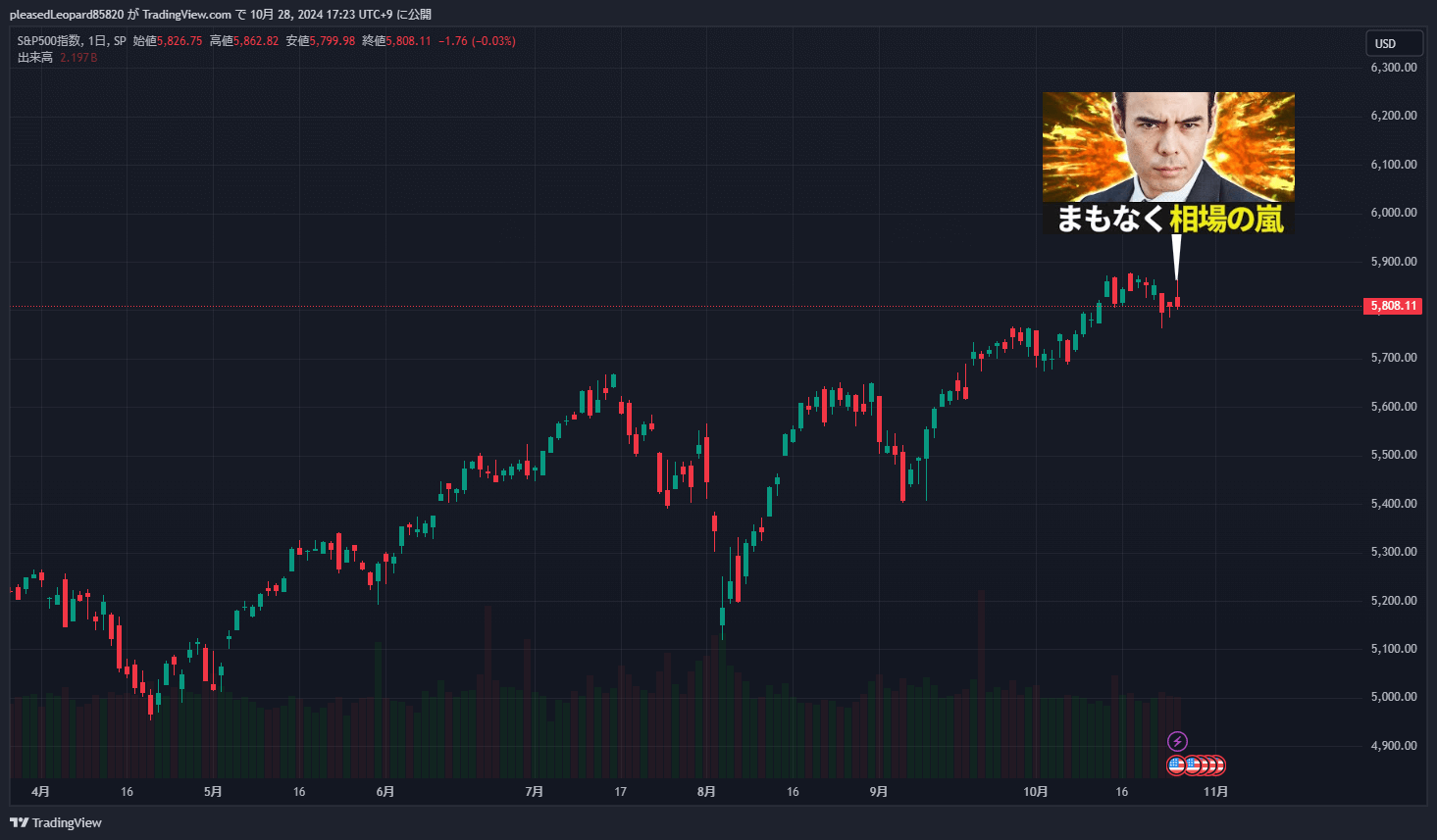 - S&P500のチャートでMACDが10/24にデッドクロスしたばかり