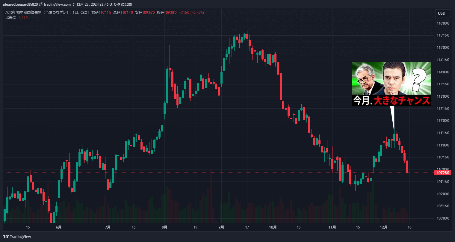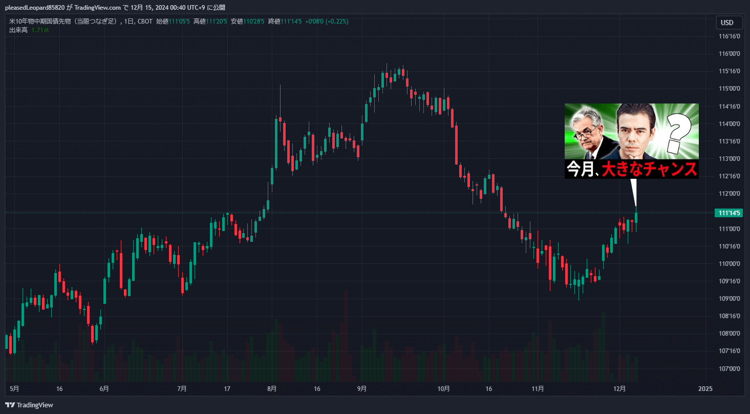 - 来週カナダ、ヨーロッパは利下げをすると思うので、カナダとヨーロッパの国債はドカンと上がる→米国国債は18日の米国中央銀行の決定会合を前に、来週から織り込みし始めて、パパッと上がり始める