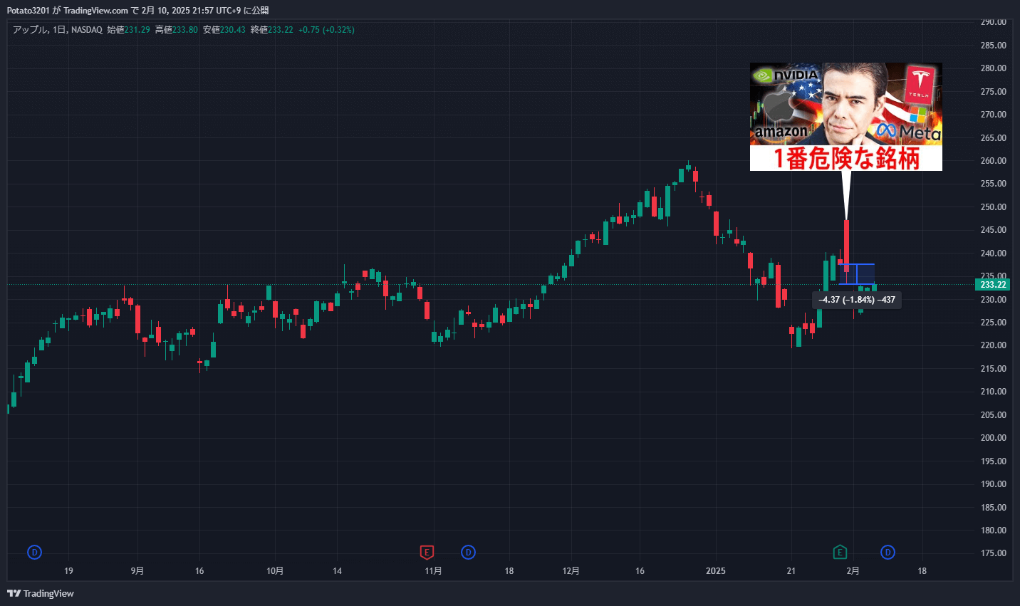 | アップル | × | 2025/1/30終値 237.59 | 2025/1/30 237.59 0.00% | 2025/2/3 228.01 -4.03% |