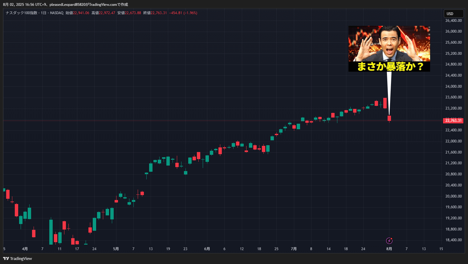 暴落するかは分からないんじゃが、ナスダック100のチャートで大きな陰線が出たんじゃ